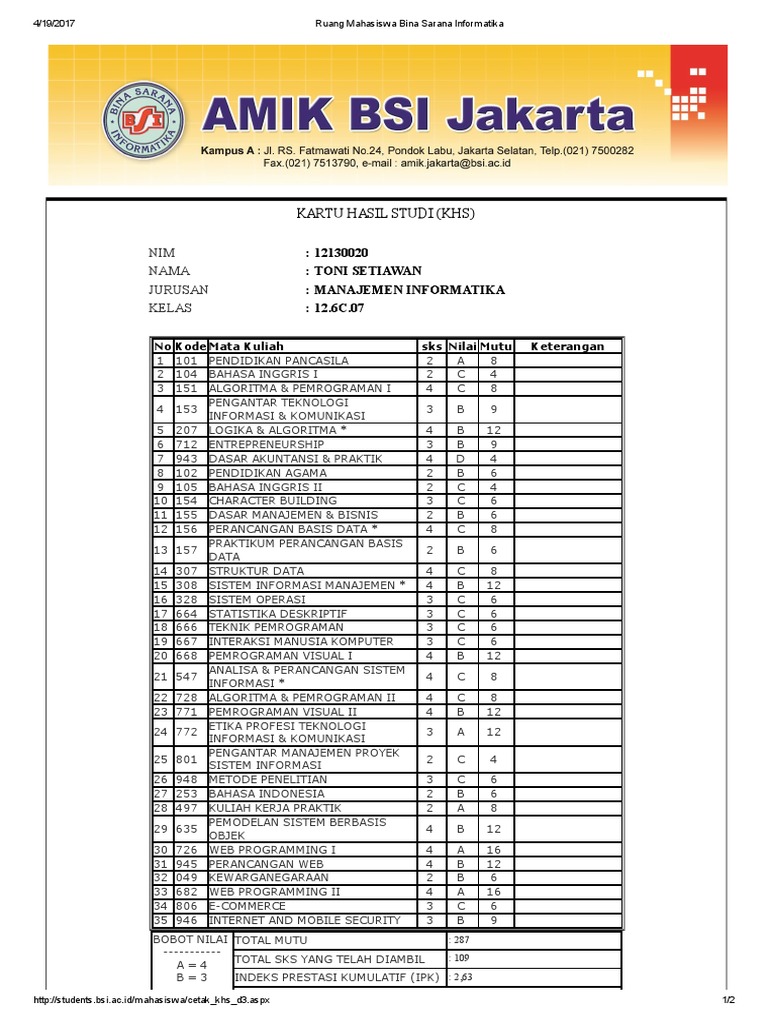 Penerimaan mahasiswa baru universitas bina sarana informatika. It reaches roughly 182,820 users and delivers about 402,270 pageviews each month. But because of the limited capacity of public college, students and parents must select a private colleg. N i p * sandi * lupa sandi anda? Fasilitas ini merupakan salah satu bentuk pelayanan dari pihak pengelola bsi dalam menyediakan informasi akademik kemahasiswaan, dan diharapkan seluruh mahasiswa bsi yang masih aktif dapat memperoleh informasi tersebut dengan mudah melalui fasilitas ini. *untuk dosen login dengan nip & password seperti ruang staff.bsi.ac.id *untuk mahasiswa aktif login dengan nim & password seperti ruang students.bsi.ac.id. Situs ini dikhususkan bagi mahasiswa/mahasiswi universitas bina sarana informatika dalam memperoleh informasi akademik (nilai), pendaftaran ujian her, skripsi, dll. Improving the quality of information both directly and indirectly can affect student satisfaction and loyalty. Its estimated monthly revenue is $1,166.70.we estimate the value of students.bsi.ac.id to be around $14,194.85.the domain students.bsi.ac.id uses a indonesia suffix and its server(s) are located in indonesia with the ip number 118.98.73.217. Saat ini anda berada di situs sistem informasi akademik mahasiswa (student.bsi.ac.id). Saat ini anda berada di situs sistem informasi akademik mahasiswa (universitas.bsi.ac.id). Ruang alumni ditujukan bagi alumni bina sarana informatika seluruh angkatan dalam rangka proses pendataan dan tracer studi alumni, sehingga antara bsi dan alumni terjadi suatu komunikasi yang harmonis The description of myubsi student app informasi akademik yang sama di student.bsi.ac.id dalam genggaman.